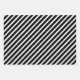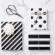 Ensemble de trois feuilles de papier d'emballage cadeau en noir et blanc. Une feuille de papier d'emballage rayée en diagonale noire et blanche, une feuille de papier d'emballage à points polka blancs et noirs et une feuille de papier d'emballage rayé horizontal noir et blanc.