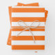 Cet ensemble de feuilles de papier d'emballage est composé d'une solide feuille de couleur orange vif avec des feuilles coordonnées de larges bandes orange vif sur le blanc, et de pois blancs sur l'orange vif.