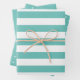 Cet ensemble de feuilles de papier d'emballage est composé d'une feuille turquoise de couleur verte avec des feuilles de coordination de larges bandes turquoises sur le blanc, et de pois blancs sur le vert turquoise.