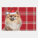 An adorable Pomeranian dog is ready for the holiday season with his Santa hat. This cute Christmas dog is paired with a red and white holiday plaid on this set of gift wrap for the dog lover.