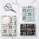 Trois feuilles de papier d'emballage de couleur différente d'une simple typographie "Happy Birthday" en utilisant des lettres de bloc pour HAPPY et un script décontracté pour Birthday. Le Number 25 est décoré de pois colorés. Un papier d'emballage que vous pouvez utiliser pour n'importe qui.