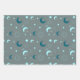 Moons and Stars: A celestial design featuring moons, stars and suns in varying shades of cyan and turquoise, on a soft grey background. This pattern is ideal for those looking for a charming and ethereal style for their gifts, perfect for baby showers or children's birthdays.