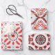 Ensemble de trois feuilles de papier d'emballage avec différents motifs en couleurs assorties. Chaque feuille est composée d'un motif géométrique homogène de style ethnique rouge, gris clair, noir et blanc.