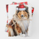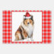Un adorable chien Rough Collie est prêt pour la saison des fêtes portant un chapeau de Père Noël mignon et associé avec un plaid rouge sur cet ensemble de enveloppes cadeau pour l'amoureux des chiens.