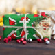 Papier d'emballage personnalisé. Ajoutez votre photo. Casquettes du Père Noël. Motif de style dessin animé. Version arrière - plan blanche.