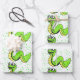 Cet ensemble de feuilles de papier d'emballage ont une image répétée de serpent mignon souriant qui est vert néon avec un estomac jaune sur un arrière - plan blanc avec des pois verts vibrants.