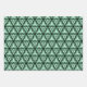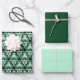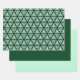 Un ensemble de trois papiers d'emballage décoratifs de 19x29" : une feuille à motifs composée d'un ensemble de spirales vertes profondes et complexes dans un motif triangulaire, et de feuilles de couleurs À feuillage persistant et vert moulé pour une collection de cadeaux sophistiquée.