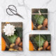 Envelopper les feuilles de papier avec la photo d'une récolte d'action de grâce, posée sur une table en bois rustique. Citrouille, pommes de terre, courge etc... composent cette belle collection de nourriture. Des feuilles d'automne colorées entourent le panier de la cornucopie.