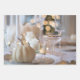 Envelopper des feuilles de papier avec une belle photo classe. Une table de vacances Thanksgiving avec porcelaine fine et verrerie. Fancy or bokeh lumières dans l'arrière - plan. Une simple épaisse épaisse est posée sur une assiette.