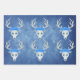 Cet ensemble de feuilles de papier d'emballage est un mélange de bleus brumeux et de blancs avec des rangées de têtes de cerfs blancs avec de grands bois blancs et trois grands roses bleus sur la tête.