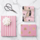 Papier d'emballage vintage à motifs rose et or parisien avec rayures, une Française avec vin et motifs rose.