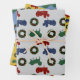 Feuilles d'emballage de Noël avec un thème de la ferme. Des images de tracteurs rouges, verts et bleus, et des couronnes de vacances composent ce motif. Chaque feuille a une couleur arrière - plan différente, dont le gris clair, le jaune or et le bleu. Parfait pour envelopper les cadeaux de Noël pour n'importe quel fermier.