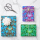 Papier enveloppé dans un vintage William Morris motif d'hyacinthes, tulipes et feuilles, en bleu turquoise et cerulean, accentué d'orange corail, sur un arrière - plan chocolat foncé, bleu aqua et cobalt, accentué de rose fuchsia, sur un arrière - plan mauve améthyste, vert émeraude et jade, accentué d'aqua et blanc, sur une forêt profonde arrière - plan vert