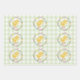 Destei's watercolor illustration featuring a yellow baby chick nestled inside a willow wreath. The wreath is decorated with colorful pastel Easter eggs. The background is a green gingham pattern.