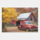 • A red truck parked beside a barn with autumn foliage