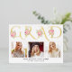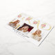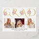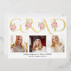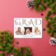 Feuille d'or faire-part de graduation photo de la typographie GRAD. Il comporte le mot "GRAD" dans une police décorative en feuille d'or, bouquets de roses roses et trois photos. Le côté arrière est doté d'un motif de bouchons blancs de graduation sur l'or.