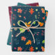 Érable, aquarelle, automne feuilles motif conçu sur trois couleurs arrière - plans différentes avec des glands. Un bleu marine ou turquoise foncé, un turquoise moyen et un arrière - plan de couleur rouge vif. Les feuilles sont de couleurs vives rouge, orange, vert, rose, violet, avec des baies rouges et bleues.
