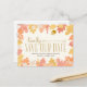 Cette carte postale rustique de save the date présente une typographie écrite à la main encadrée par de jolies feuilles d'automne. Des feuilles de chêne et d'érable entourent l'écriture dans des tons de jaune de moutarde, de rose corail, d'orange mandarine et de sable neutre.