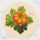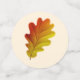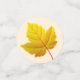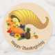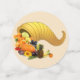 Belle corne d'abondance avec citrouille, fruits et feuilles d'automne sur confettis de table beige clair.