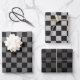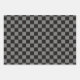 Un trio de feuilles de papier d'emballage noir et gris. Il y a une feuille de papier d'emballage gris clair et noir, une feuille de papier d'emballage à damiers noir et gris et une feuille de papier d'emballage gris foncé et noir. Veuillez voir toutes les photos.
