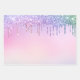 Un visage amusant de licorne avec fausse parties scintillant et une parties scintillant de coordination dégoulinant une feuille de couleur solide.
