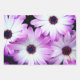 Papier d'emballage cadeau avec des feuilles qui ont des images de fleurs et de coeurs violets.