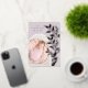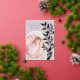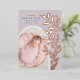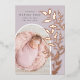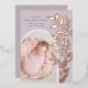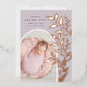 Faire-part de naissance chic et moderne, avec une seule photo verticale/portrait en forme d'arche, avec des vignes d'escalades de feuilles botaniques roses en feuille d'or sur le côté droit. Personnalisez avec le nom de votre bébé, la date de naissance et les statistiques, et ajoutez un message personnel au dos, ainsi qu'une photo supplémentaire.