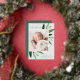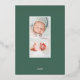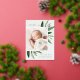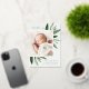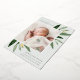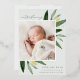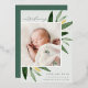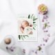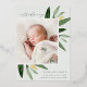 Faire-part de naissance élégante avec une seule photo verticale/portrait ornée de délicats feuilles d'aquarelle vert printanier et d'accents de feuille d'or. Personnalisez avec le nom de votre bébé, la date de naissance, les statistiques et une signature familiale. Ajoutez deux photos carrés supplémentaires à l'arrière.