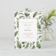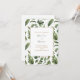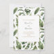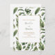 Feuilles verts, style jungle, faire-part de mariage forestier avec style calligraphie stylisé. Script élégant pour les noms et texte clair en gras pour les détails du mariage.