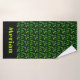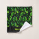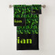 De grands feuilles verts tropicaux ressemblant au feuillage de Monstera sur un arrière - plan noir créent un bel ensemble de serviettes de bain. Personnalisez avec votre nom en texte vert vif sur un arrière - plan noir.