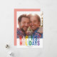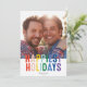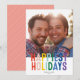 Cette carte de vœux photo pour les fêtes présente une typographie arc-en-ciel sur fond blanc avec une seule photo verticale. Le message sur le devant dit "Joyeuses Fêtes". Ce design accueille une seule photo verticale sur le devant de la carte. Au verso, vous trouverez un motif à rayures diagonales rouge et blanc festif qui peut être supprimé ou personnalisé. Vous pouvez également ajouter une autre photo ou du texte au verso en sélectionnant "personnaliser davantage le design".