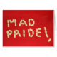 Les mots "FIERTÉ FOLLE !" défini utilisant des pilules d'antidépresseur sur un arrière - plan rouge.