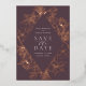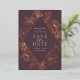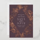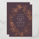 Une élégante sauvegarde de la conception de date avec vos détails mariages en lettrage blanc cassé chic, niché dans un élément géométrique en forme de losange. Une bordure florale complexe de feuilles d'or roses et de feuillage se propage contre un arrière - plan violet bordeaux profond.
