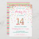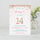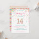 Fêtez l'anniversaire de votre quatorze ans avec de l'or coloré, du rose, de la menthe et des confettis turquoises sur ces invitations à 14e anniversaire ! Avec les détails de la fête de votre fille et le numéro "14" en confetti. Ce design adorable est super mignon et girly.