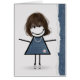 Jolie fille au bâton avec des cheveux et portant des baskets, un collier de perles et une robe en jean en denim bleu sur un bord de papier déchiré avec une bordure en denim bleu.