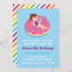 Une invitation mignonne qui est grande pour l'été ! Elle comporte une fille dans un costume de bain pourpre avec une boisson dans sa main, lounging dans la piscine sur un flotteur rose de bain de beignet de givrage avec l'arc-en-ciel arrose. Personnalisez facilement avec vos détails de partie dans l'espace fourni.