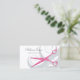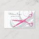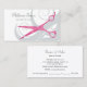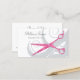 Un carte de visite de salon de coiffure girly pour la coiffeuse moderne avec une paire de ciseaux roses chauds brillants conçus avec un motif amusant à la paillette entrelacé dans une masse de boucles silhouettes. Personnalisez en ajoutant votre nom et vos coordonnées à l'arrière. Il y a une ligne pour les instructions spéciales comme un rappel pour vos clients au prochain rendez-vous. Impression plane, PAS métallique ou paillettes.