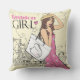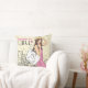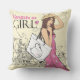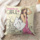 Oreiller décoratif élégant avec une fille de mode avec un sac dans un style croquis sur un fond de ville.