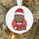 Ornement de Noël avec l'illustration d'une mignonne fille afro-américaine souriante aux cheveux noirs courts, la fille porte un costume de Père Noël avec un casquette rouge et tient un cadeau ; dans un cercle rouge sur un arrière - plan blanc