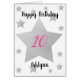 Carte d'anniversaire personnalisée avec des étoiles argentées parsemées à l'avant. Vous pouvez facilement personnaliser la grande étoile d'argent avec son âge d'anniversaire et son nom sous l'étoile. Le message de la carte intérieure dit : "Pour une fille qui brille et brille comme nul autre ! Joyeux anniversaire !" peut aussi être facilement personnalisé si vous le souhaitez. Le verso de la carte d'anniversaire personnalisée indique Joyeux Anniversaire 2018.