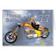 Une fille blonde couchée à travers une moto à hélicos avec des étoiles et des nuages dans l'arrière - plan. Une belle carte d'anniversaire pour les amateurs de moto.