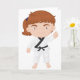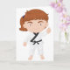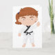 Le karaté est une grande activité à impliquer dedans. Cette conception a une fille faire le karaté. Elle est en ligne visage debout et la fille montre une pose de karaté. Elle est habillée dans le plein équipement de karaté. Cette fille faisant la conception de karaté semble grande sur ces cartes de voeux
