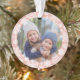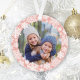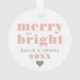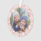 Cet élégant ornement photo de vacances dispose d'un cadre de flocon d'hiver en or rose sur le devant avec espace photo. Le dos de l'ornement comprend une coordination rose or et pewter gris "Joyeux et brillant" conception typographique en lettres en gras avec texte personnalisé pour les noms / un nom de famille et l'année. Les couleurs peuvent être customisées pour être coordonnées avec votre décor.