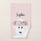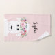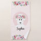 Cette serviette de bain moderne et fillette présente un beau mouton blanc peint à la main avec une magnifique couronne de fleurs dans ses cheveux. Ce dessin d'agneau floral blanc à l'aquarelle vous permet d'ajouter le nom de votre fille à une typographie élégante. Le design animal de ferme parfait pour votre petit.
