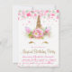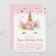Invitations à la fête d'anniversaire de la licorne avec adorable visage de licorne rose avec des cils dorés souriants et une corne florale sur un bel arrière - plan pastel confetti bubble point . Cette douce invitation à la fête d'anniversaire de licorne est facilement customisée pour votre événement en ajoutant simplement vos détails. Vous pouvez également changer la couleur arrière - plan sur cette adorable invitation à la licorne. Il s'agit d'un dessin imprimé sans véritable parties scintillant.