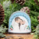 Mark your first holiday season as a family of three with this charming custom snow globe design. Set against a soft blue snowy background with playful snowflakes, a smiling snowman, and a festive Santa by snowy trees, your personal photo takes center stage. The elegant handwritten-style curved text reads "Our First Christmas as a Family of Three," making it a heartfelt keepsake or thoughtful holiday gift for new parents celebrating their first Christmas with a baby.