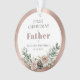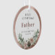 First Christmas as Father Personalized with Baby's Name, Birthdate, and Photo Round Acrylic Keepsake Ornament... A lovely bouquet of pink roses, pine cones, and holiday season botanicals decorates the rose gold metallic frame circling the text on front of your Christmas ornament gift for fathers. On back of the ornament is the baby's photo also framed by metallic rose gold. The example wording on this keepsake ornament reads "First Christmas as Father of Bethany Westfield 05.15.2025". All example text and the placeholder photo can be easily revised with your own on the personalization template.