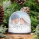 Commemorate your engagement with this beautiful modern keepsake snow globe. The text of Side 1 reads "Our first Christmas engaged," with the word "engaged" in elegant dusty blue handwriting script with flourishes before and after. On Side 2, add your names in the same dusty blue calligraphy script, with the year below in sans serif font. Replace the two sample images with your favorite photos. A white gradient filter helps make the text pop.