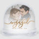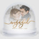 Commemorate your engagement with this beautiful modern keepsake snow globe. The text reads "Our first Christmas engaged," with the word "engaged" in elegant gold faux foil handwriting script with flourishes before and after. Replace the sample image with your favorite photo, and add your names and the year in gold-colored sans serif font. A white gradient filter helps make the text pop.