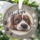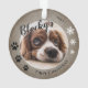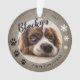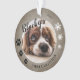 Nom du chien rustique de Noël du premier chiot et ornement photo. L'arrière - plan est gris rustique avec des flocons blancs et des empreintes de pattes noirs. Personnalisez l'ornement avec la photo, le nom et l'année de naissance de votre chien - insérez votre photo de chiot préférée. Vous pouvez utiliser cet ornement personnalisé pour n'importe quel animal de compagnie. Une belle tenue de vacances pour un propriétaire de chien.
